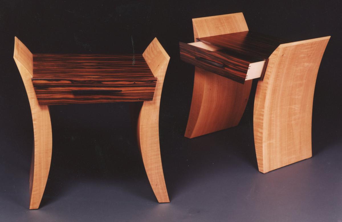 Hank HolzerSeattle, WA Whimsical imagery in these pieces made to accompany the Vagner Bed. Made from Madrona and Ebony veneers. Materials Ebony Madrone Dimensions 24 × 14 × 26 in Pricing $2,700.00Built on demand Contact This Artist Email Personal website
