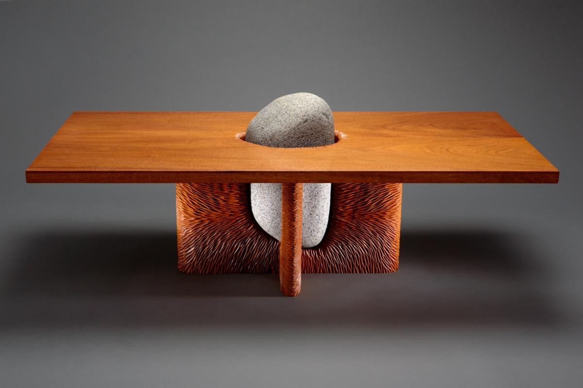 The Tsubo Coffee Table is made from a natural beach stone held in a carved mahogany base. The stone coming through the top gives it the feel of a landscape or Japanese rock garden. The weight of the stone is used to balance the cantilever of the top. This table can be custom made in a variety of sizes and materials.
